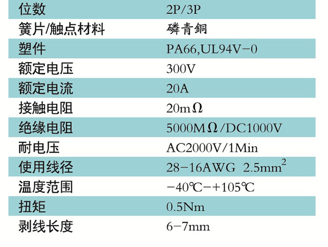 接線端子的絕緣材料用改性的尼龍(PA66),能達到或超過IEC947-7-1EN60947-7-1標準,阻燃等級達到UL94V-0具有良好的電氣性能和機械性能。螺絲用高強度的鋼制成鍍鋅或鎳處理,導電體四方針用合金銅制成表面鍍錫,壓片采用彈性及極強的磷青銅表面鍍錫或鎳;壓線框用抗應力裂縫腐蝕的合金銅制成,這些金屬表面還鍍錫或鍍鎳加以保護。設計完全符合IEC60947-7-1.GB14048.7等標準。
